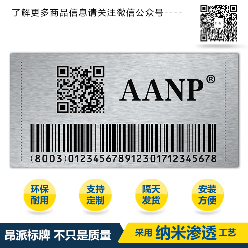 科技公司條碼銘牌標(biāo)牌 時(shí)間:2018-05-21 16:51:05 分類(lèi):金屬條碼 瀏覽:次 金屬二維碼采取高科技印刷工藝以及質(zhì)量?jī)?yōu)勢(shì): 金屬二維碼---進(jìn)口鋁板---高科技德國(guó)印刷技術(shù)---耐摩擦,耐溶劑,耐高溫,抗摩擦,耐紫外線(xiàn),耐化學(xué)品性,耐腐蝕性,滲透印刷技術(shù)做出來(lái)的金屬二維碼使用壽命久不易掉色,金屬二維碼識(shí)別率快,掃描識(shí)別率高,并能保持光潔。 分享收藏: 上一個(gè): 車(chē)輛條碼牌銘牌標(biāo)牌 下一個(gè): 石油二維碼銘牌標(biāo)牌 相關(guān)產(chǎn)品